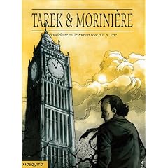 Surprenant. Pas forcément dans le bon sens, cependant. Tout d'abord par la prédominance du nom des auteurs sur le titre de la bande-dessinée, qui laisse penser que Mosquito, l'éditeur, a davantage cherché à imposer une marque, un label, celui de « Tarek & Morinière », plutôt qu'une oeuvre originale ; le contenu est tout autant déconcertant. Le décor, planté en noir et blanc, fait émerger la grisaille qui git dans les sombres oripeaux du crâne de Baudelaire, qui comme on le sait, héberge, planté, là, bien profond, un drapeau noir. En berne, il reflète l'esprit à la fois torturé de ce poète et la volonté en demi-teinte du graphiste de donner une identité à son oeuvre. Pari à demi-réussi, ou semi-échec, selon votre vision des choses, puisque la forme, puisque c'est elle qui nous intéresse pour le moment, patit de certaines imperfections qui troublent un peu plus l'univers noirâtre de la bande-dessinée. Je m'explique : les expressions faciales de Charles Baudelaire, par exemple (toujours affublé du sobriquet « Baudelaire »), ne sont pas toujours criantes de vérité, et s'avèrent donc parfois en inadéquation avec les propos qu'il est censé tenir simultanément. Montrant les crocs, grimaçant alors que l'assertion n'a pas lieu de le faire grimacer de cette manière, le lecteur (que je suis) serre autant les dents qu'il les fait grincer, à la vue de ces petits détails qui agaçent.